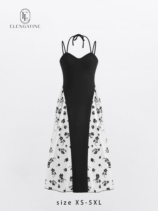 Elengatine Viral Black & White Floral Maxi Dress for Women | Spaghetti Strap Patchwork Long Dress | Slim Fit, Flowy & Breathable Fabric | Perfect for Spring Summer Outfits, Vacation, Brunch, Date Night, Elegant Street Style & Tiktok USA Trends